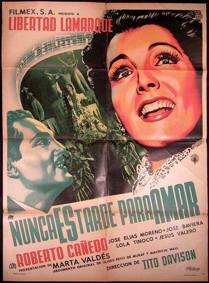 Striking Mexican movie poster with superb close-up images of the two main stars, Lamarque and de Cordova. This onesheet has bold, saturated colors and a film-noirish style... The film starred Libertad Lamarque, Arturo de Cordova, Lilia del Valle, Victor Junco and Anita Blanch. $165 |