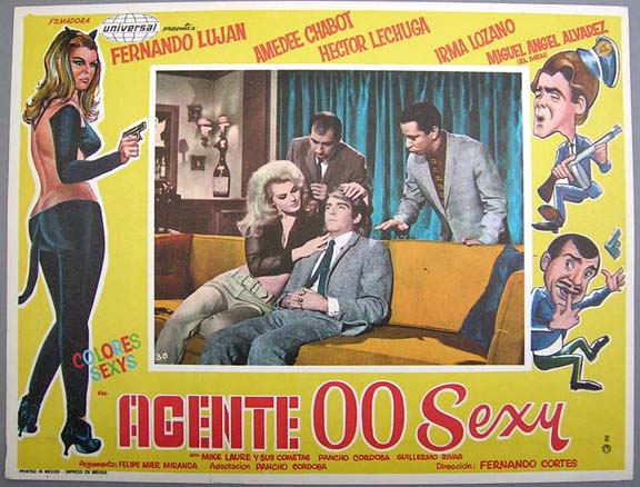 Gorgeous spy spoof lobby card features an incredible image of the sexy Ms. Chabot in her cat-girl costume... This film starred Fernando Lujen, Amadee Chabot, Hector Lechuga and Irma Lozano. Cat outfit scenes - $25 each ... Other cards - $15 each |
