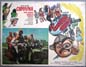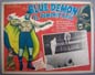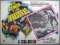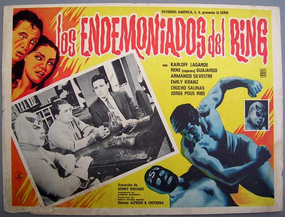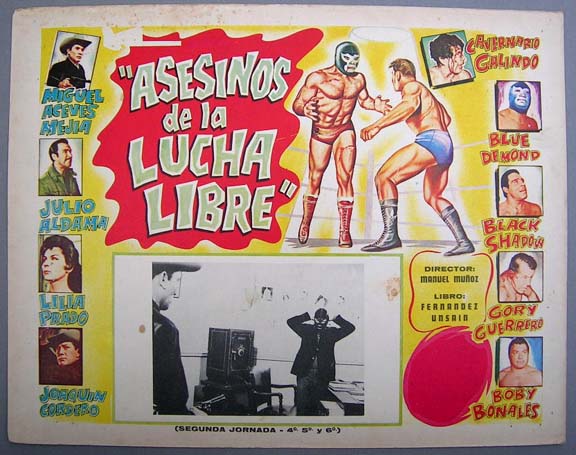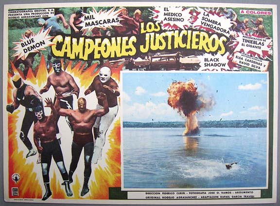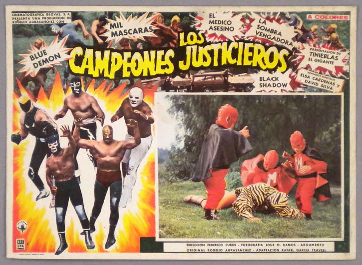 Incredible lobby card from an amazing lucha libre / sci-fi film -- the Mexican answer to the "Justice League of America." The card features superb border art picturing the five heroic masked wrestlers -- plus a scene of several masked wresling midgets standing over a defeated Mil Mascaras. WOW!... This movie starred Blue Demon, Mil Mascaras, Tinieblas, Medico Asesino, Sombra Vengadora, Elsa Cardenas and David Silva. $45 |