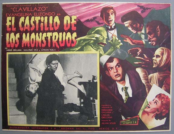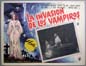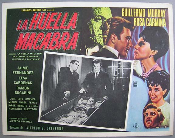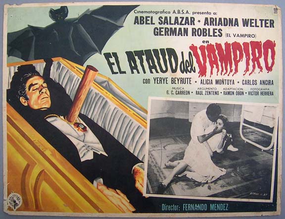 Classic horror film lobby card has artistic border graphics features Robles sleeping in a coffin, as a vampire bat hovers above him. Excellent sequel to classic Mexican horror film, El Vampiro. The card has average signs of handling -- pinholes, edge wear, mild soiling -- but the colors are bright and there are no major flaws... This movie starred Abel Salazar, Ariadna Welter, German Robles, Yerye Beirute and Alicia Montoya. $15 each |