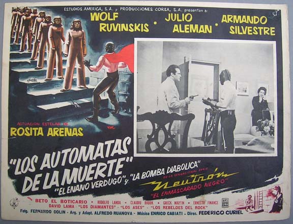 Striking sci-fi / lucha libre lobby card from the second film of the "Neutron el Enmascarado Negro", series. The border art pictures the masked hero facing a column of hideous zombies. The card has light to moderate signs of use, but no major flaws... This movie starred Wolf Ruvinskis, Julio Aleman, Armando Silvestre, Rosita Arenas and Rodolfo Landa. $15 each |
