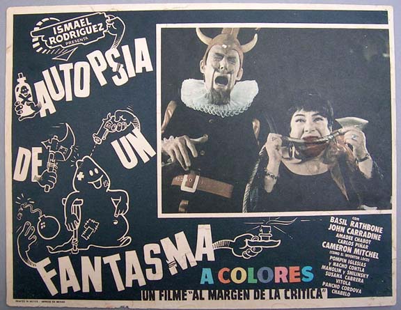Beautiful comedy / fantasy lobby card combines humor with horror, to good effect. The art work features caricatures of some of the biggest names in Mexican comedy -- in the form of ghosts -- surrounded by some sexy female ghosts. Light wear -- no major flaws... This movie starred Antonio 'Clavillazo' Espino, German 'Tin-Tan' Valdes, Adalberto 'Resortes' Martinez, Manuel 'Loco' Valdes, Maria Eugenia San Martin, Sonia Infante, Maria Victoria and Marga Lopez. $20 each |