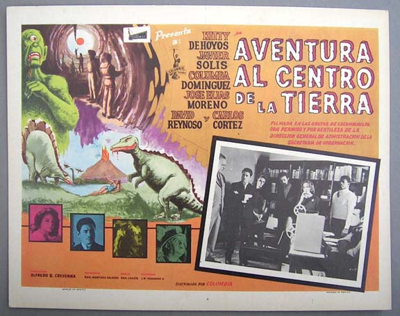 Colorful sci-fi / horror film lobby card (11x14") features great monster graphics, including dinosaurs and a cyclops. This was the Mexican version of, Journey to the Center of the Earth... This movie starred Kitty de Hoyos, Javier Solis, Columbia Dominguez and Jose Elias Moreno. $15 each |