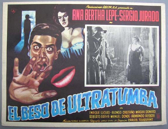 Great horror film lobby card features atmospheric graphics layed out in a very distinctive style. Light wear -- no major flaws... This movie starred Ana Bertha Lepe, Sergio Jurado, Enrique Lucero and Magda Donato. $15 |