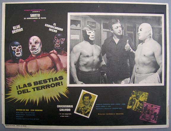 Colorful lucha libre film lobby card has nice portraits of three masked wrestlers on the border art -- although only Santo and Blue Demon actually appear in the film. Light wear -- no major flaws... This movie starred El Santo, Blue Demon, Elsa Cardenas, Cavernario Galindo and Antonio de Hud. $15 each |