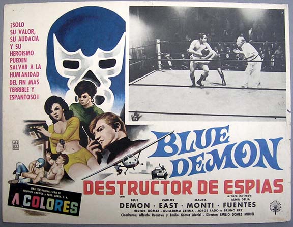 Attractive lucha libre / spy film lobby card has a large face of Blue looming over a montage of James Bond type action scenes. The card has light to moderate signs of use, but no major flaws... This movie starred Blue Demon, Carlos East, Maura Monti, Alma Delia Fuentes and Hector Gomez. $15 each |