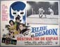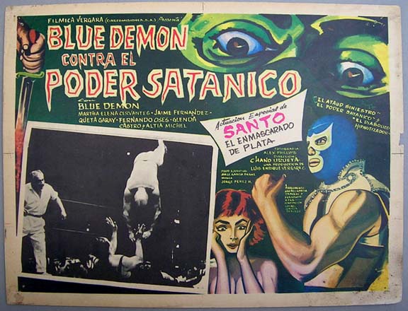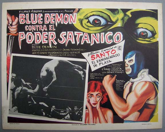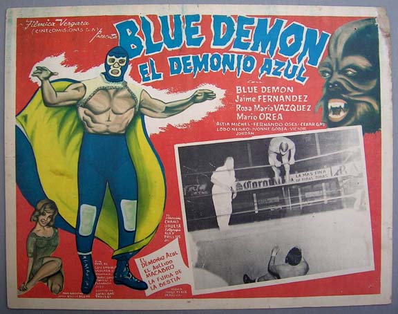 Striking lucha libre / horror film lobby card (12.5x16.5") features a great portrait of Blue Demon on the border art, plus great atmospheric images in the B&W photo-scenes. Second film in the Blue Demon series, with Santo making a guest appearance. The card has average signs of handling -- pinholes, edge wear, some soiling -- but the colors are bright and there are no major flaws... This movie starred Blue Demon, Martha Elena Cervantes, Jaime Fernandez and El Santo. $20 each |