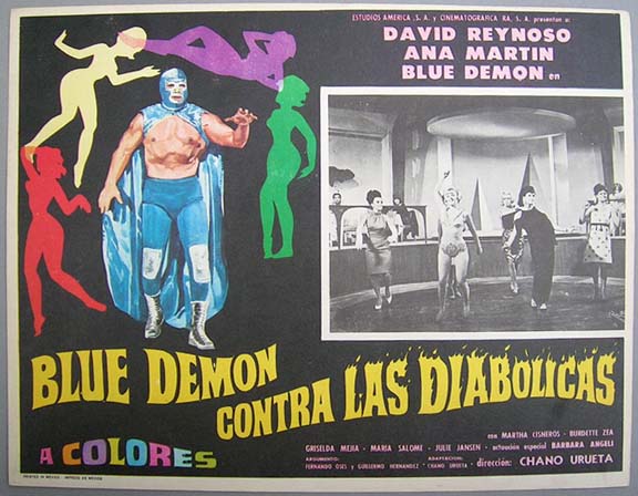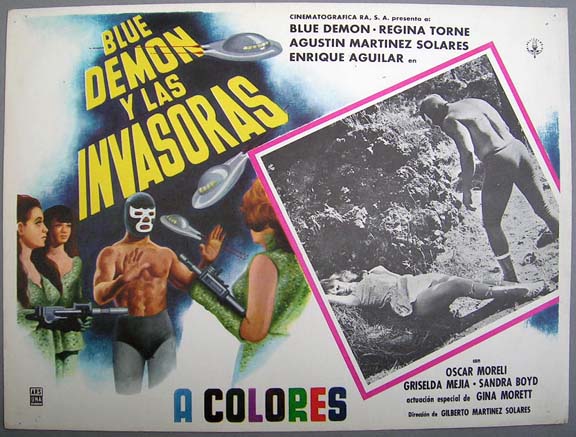 Colorful lucha libre / sci-fi film lobby card features superb 'naive' artwork, depicting sexy space-women, the blue masked-wrestler, plus some flying saucers. Light wear -- no major flaws... This movie starred Blue Demon, Regina Torne, Agustin Martinez Solares and Enrique Aguilar. $20 each |
