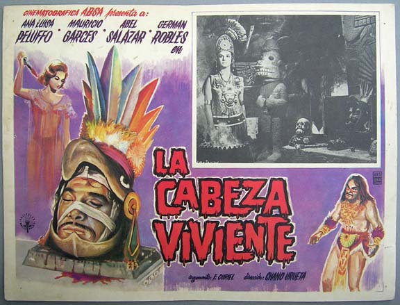 Vibrantly colored horror film lobby card featuring a nice portrayal of the 'Living Head' of the title... This movie starred Ana Luisa Peluffo, Mauricio Garces, Abel Salazar and German Robles. $15 each |