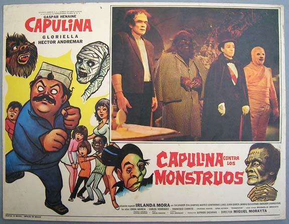 Appealing horror / comedy film lobby card finds comedian Capulina battling the Mummy, the Wolf Man, Frankenstein and a vampire. Nice monster graphics... This movie starred Gaspar 'Capulina' Henaine, Gloriella, Hector Andremar, Irlanda Mora, Salvador Vea and Frankenstein. Monster scenes - $20 each ... Other cards - $15 each |