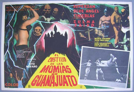 Masked wrestlers, a sexy woman, ugly mummies and evil midgets .... what more could you want? Giant lobby cards (or Half-sheets) are horizontal format posters that measure approximately 16.5"x 24" and they usually have a single vertical fold. These posters (printed on heavy stock paper) were produced in place of standard Mexican lobby cards for some films in the early 1970s (particularly for the films distributed by Rogelio Agrasanchez). GLCs feature full-color artwork covering most of the poster, with a small B&W inset images picturing a scene from the film. The poster has some light wear on the borders and along the fold, but this minor flaw doesn't greatly affect the colorful image area... This movie starred Superzan, Tinieblas, Blue Angel, Zulma Faiad, Maria Salome and Tito Novaro. $25 each |