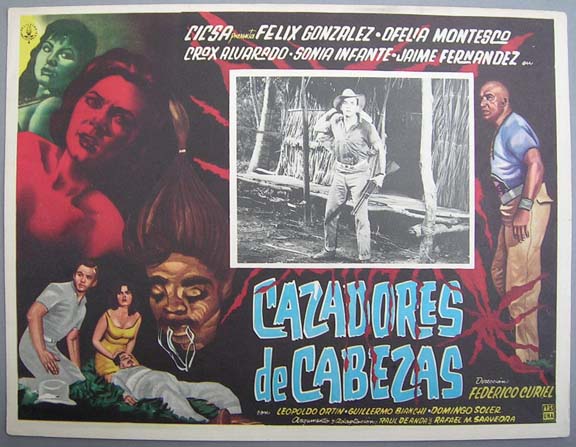 Colorful jungle adventure film lobby card has great artwork, including some sexy women and a shrunken head... This movie starred Felix Gonzalez, Ofelia Montesco, Crox Alvarado and Sonia Infante. $15 each |