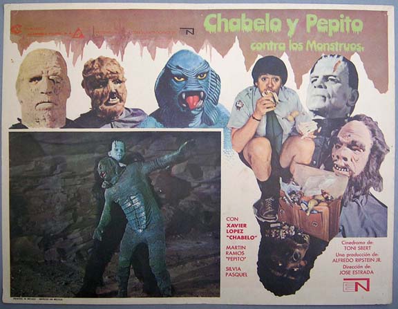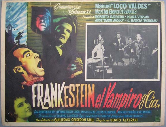 Memorable comedy / horror film lobby card has great portraits of many classic monsters, including: the Creature from the Black Lagoon, the Mummy, the Wolfman, Frankenstein and Mr. Hyde. The color inset scenes also features great images of the monsters. Light wear -- no major flaws... This movie starred Javier Lopez, Martin Ramos Arevalo, Silvia Pasquel and Frankenstein. $25 each |