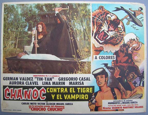 Colorful horror / fantasy film lobby card features a nice montage of images, including comedian Tin Tan, a hungry vampire, a large tiger and some scuba divers. The movie follows the adventures of popular comic book hero, Chanoc. The card has light to moderate signs of use, but no major flaws... This movie starred German 'Tin Tan' Valdes, Gregorio Casal, Aurora Clavel and Lina Marin. $15 each |