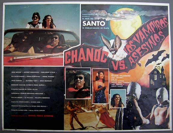Colorful lucha libre film lobby card, from the first movie in the "Son of Santo" series. The masked wrestler teams up with popular comic book hero, Chanoc. Portrayed in the artwork is the classic scene where Santo Sr. passes off his mask to his real-life son. Average wear -- no major flaws... This movie starred Hijo del Santo, Nelson Velazquez, Naomi Ra, Arturo Cobo, Carlos Suarez and El Santo. Santo Scene - $25 ... Other cards - $15 each |