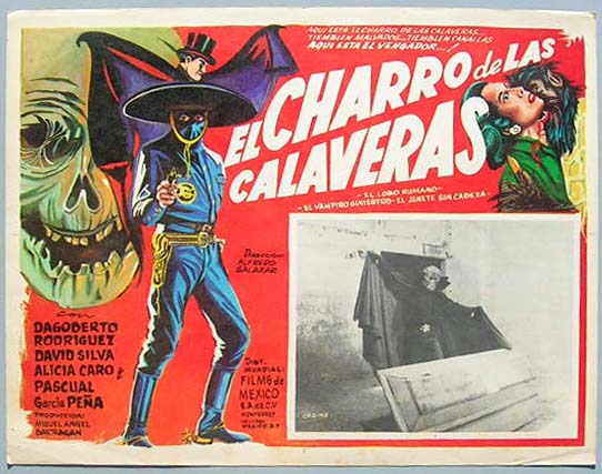 Colorful horror / western film lobby card features a great image of the masked hero, plus shots of a werewolf, a vampire and a skull faced monster. There are also great images of the masked charro and the evil beasts in the B&W inset-scenes. Light wear -- no major flaws... This movie starred Dagoberto Rodriguez, David Silva, Alicia Caro and Pascual Garcia Pena. $20 each |
