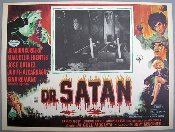 Colorful horror film lobby card with a nice image of Cordero as the evil Doctor. There are also fine caricatures of the other main cast members, including a sexy Ms. Romand in lingerie... This movie starred Joaquin Cordero, Alma Delia Fuentes, Jose Galvez and Gina Romand. $15 each |