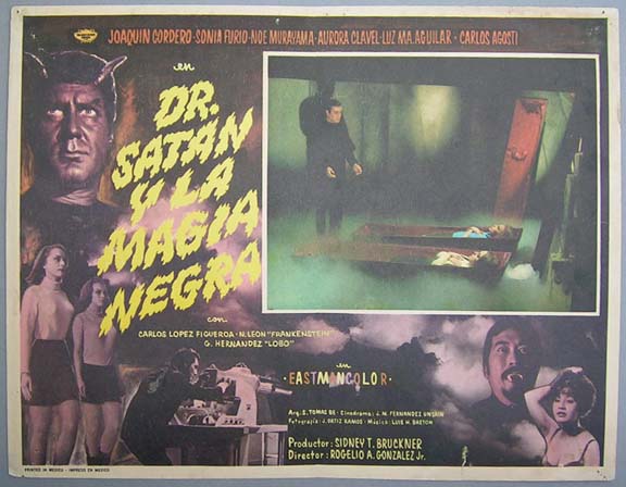 Lurid horror film lobby card has a wild montage of images, including: a vampire, female zombies, a horned devil and scientific gadgets. The card has light to moderate signs of use, but no major flaws... This movie starred Joaquin Cordero, Sonia Furio, Noe Murayama, Aurora Clavel and Carlos Agosti. $15 |