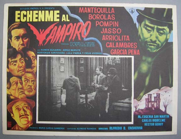 Beautiful horror film lobby card pictures a sexy female vampire wearing a see-thru negligee -- with flying bats and a graveyard in the background. The cards also have great, atmospheric, B&W photo-scenes. Light wear -- no major flaws... This movie starred Erna Martha Bauman, Rafael Del Rio, Carlos Agosti, Tito Junco and Mantequilla. $20 each |