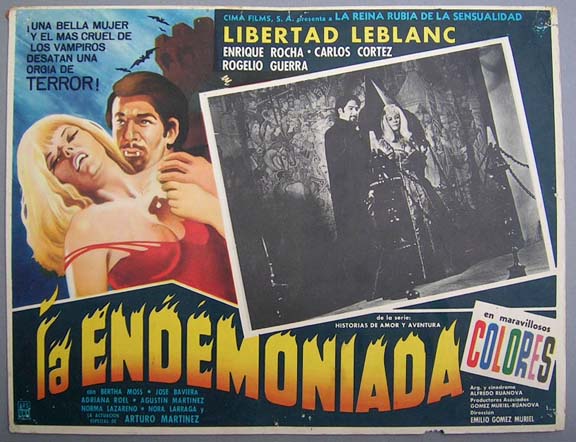 Beautiful horror / sex film lobby card has a great image of a vampire holding his willing female victim -- the sexy and buxom Ms. Leblanc. This erotic semi-vampire film features nudity and some sadistic murders. This is a used card that has some pinholes, edge wear, a few tears along the edges, and some mild soiling. However, none of these flaws are too distracting, and otherwise, the colors are bright & there are no major flaws... This movie starred Libertad Leblanc, Enrique Rocha, Carlos Cortez and Rogelio Guerra. $15 each |