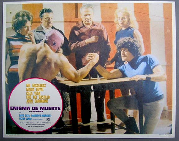 Unusual lucha libre film lobby cards (11x14") from this fourth outing for Mil Mascaras. This card has no border art, just a color-scene covering the entire card surface... This movie starred Mil Mascaras, John Carradine, Maria Duval, Isela Vega and David Silva. Mil Mascaras scenes - $15 each ... Other cards - $10 each |