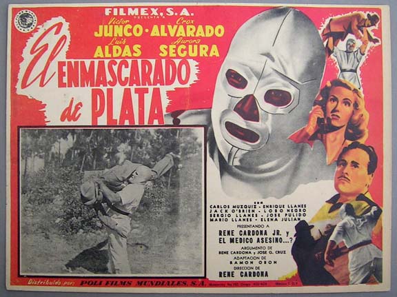 Classic lucha libre serial / film lobby card (10.5x13.5") has a great portrait of masked wrestling hero, El Medico Asesino (not Santo, as is widely believed). The heroic luchador has to face two cool looking masked villains and an assortment of sci-fi gadgets... This movie starred Medico Asesino, Crox Alvarado, Victor Junco, Luis Aldas and Rene Cardona Jr. $15 each |