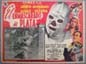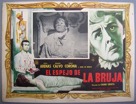 Attractive horror film lobby card with an unusual design -- the images of the film are portrayed as if they are being reflected in a mirror. The artwork combines witchcraft, dismemberment and a mad doctor. Light wear -- no major flaws... This movie starred Rosita Arenas, Armando Calvo, Isabela Corona and Dina De Marco. $25 |