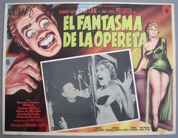 Colorful comedy / horror film lobby card features a nice portrait of the Phantom, plus pictures a sexy femme fatale. Great Mexican musical comedy version of the classic story, The Phantom of the Opera... This movie starred German 'Tin Tan' Valdez, Ana Luisa Peluffo, Marcelo Chavez, Vitola and Antonio Brillas. $20 each |