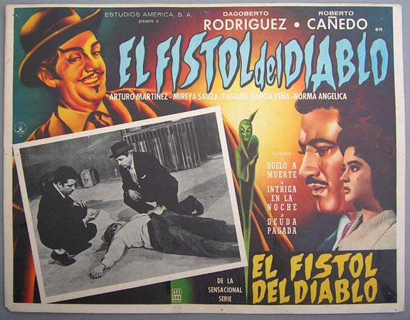 Beautiful Mexican horror / crime film lobby card features a superb image of a demonic villain, plus portraits of other cast members. First of a 4-film horror series. Light wear -- no major flaws... This movie starred David Silva, Roberto Canedo, Jorge Fernandez, Nora Veryan and Patricia Nieto. $15 each |