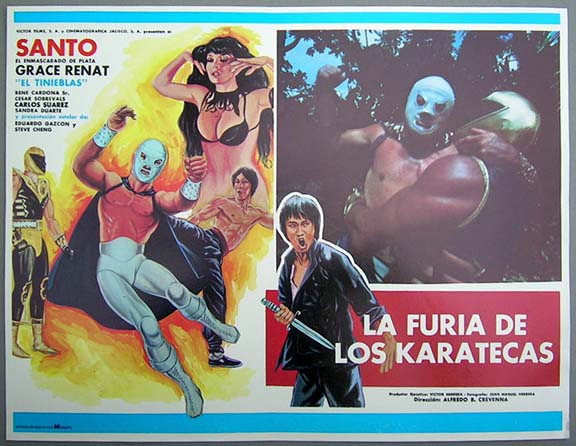 Glossy lucha libre / martial arts film lobby cards feature beautiful artwork picturing Santo, fellow luchador Tinieblas, plus the amazingly endowed Ms. Renat. Santo - appearing in this one of his last films... This movie starred El Santo, Tinieblas, Grace Renat, Rene Cardona and Cesar Sobrevals. $15 each |