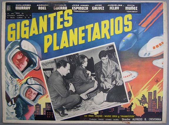 Unusual sci-fi film lobby card with vibrant artwork featuring a number of cool looking spaceships and flying saucers, plus a couple of astronauts. Made concurrently with, Planeta de las Mujeres Invasoras. The card has an area of wear / discoloration along the top edge -- at Rogelio Guerra's name -- but this flaw is not too distracting. Otherwise the colors are bright and the card will display nicely... This movie starred Guillermo Murray, Adriana Roel, Jose Angel Espinoza and Frankenstein. $15 each |