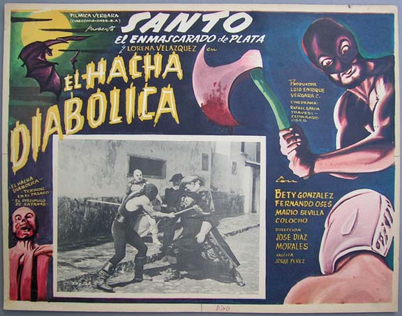 Striking lucha libre / horror film lobby card features great macabre graphics, including flying bats, a decayed corpse and a hooded demon. The silver masked Santo faces off against a black-masked, axe-wielding monster. This is a used card that has some pinholes, edge wear, a few tears along the edges, and some mild soiling. However, none of these flaws are very distracting, and otherwise, the colors are bright & there are no major flaws... This movie starred El Santo, Lorena Velazquez, Betty Conzalez and Fernando Oses. $20 each |