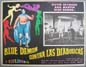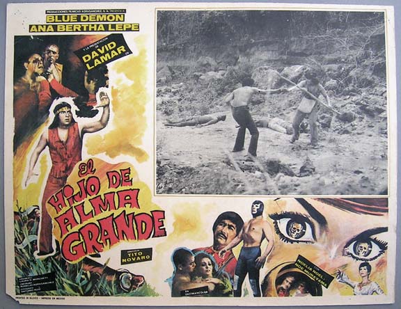 Colorful lucha libre / horror film lobby card has a nice montage of images, including: aliens, sexy women and gory torture. Blue Demon and Alma Grande face a cult of evil space invaders in this interesting action / wrestling film. The card has average signs of handling -- pinholes, edge wear, mild soiling -- but the colors are bright and there are no major flaws... This movie starred Blue Demon, Ana Bertha Lepe, David Lamar, Noelia Noel and Noe Murayama. $10 each |