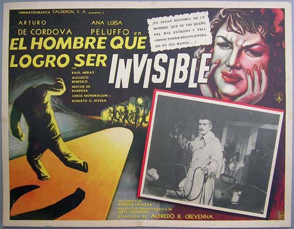Attractive sci-fi / horror film lobby card pictures a frightened Ms. Peluffo, plus the Invisible Man, who running from the police. Light wear -- no major flaws... This movie starred Arturo De Cordova, Ana Luisa Peluffo, Raul Meraz and Augusto Benedico. $15 each |