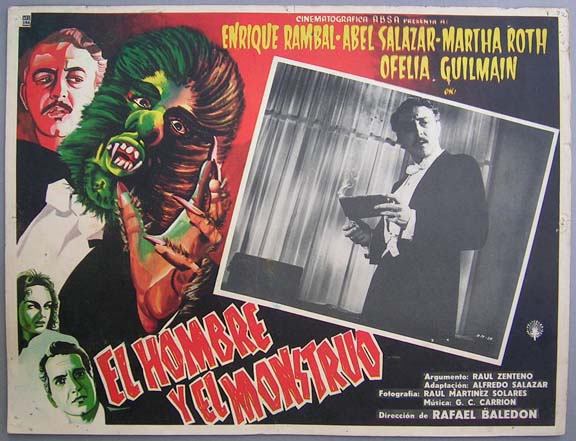 Incredible horror film lobby card features a classic close-up image of the werewolf like monster. The film combines elements of various fantasy related stories/legends, including: the Wolfman, Faust, and Dr. Jekyll and Mr. Hyde. The card has light to moderate signs of use, but no major flaws... This movie starred Enrique Rambal, Abel Salazar, Martha Roth, Ofelia Guilmain and Carlos Suarez. $20 each |