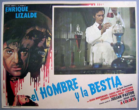 Striking horror / sci-fi film lobby card features a great portrait of Dr. Jekyll and the Mr. Hyde monster on the border art. Light wear -- no major flaws... This movie starred Enrique Lizalde, Sasha Montenegro, Carlos Lopez Moctezuma, Eduardo Noriega and Nancy Compare. $15 each |