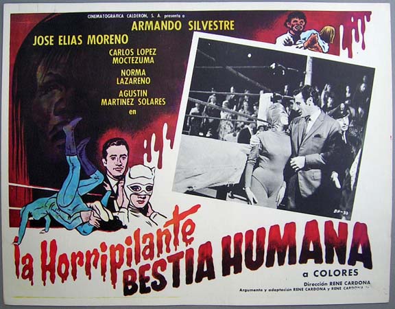 Attractive lucha libre / horror / sci-fi film lobby card from a remake of "Doctor of Doom." The border art depicts wrestling women and an ape- like monster... This movie starred Armando Silvestre, Norma Lazareno, Jose Elias Moreno, Agustin Martinez Solares and Carlos Lopez Moctezuma. $15 each |