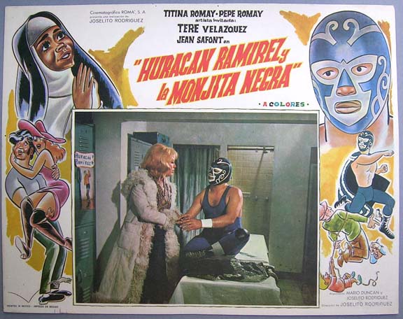This colorful lucha libre film lobby card features nice caricatures of the masked hero and several other characters. The film teams a masked wrestler with a black nun. What will they think of next? Same artwork as the onesheet... This movie starred Huracan Ramirez, Tere Velazquez, Pepe Romay and Titina Romay. Huracan scenes - $20 each ... Other cards - $10 each |