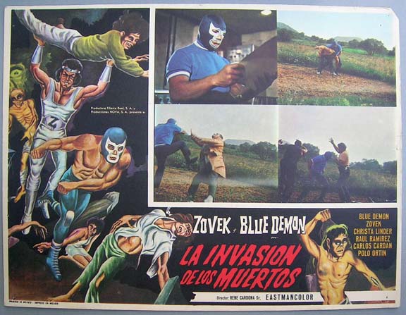 Great horror / sci-fi / lucha libre film lobby card features wonderful 'naive' artwork. The border art pictures Blue Demon and Zovek battling some gruesome zombies. The color inset scene is divided into 4 mini action/zombie images. In real life, Zovek was a Houdini-like magician who often performed death-defying escapes -- and he died (during the shooting of this movie) performing one such stunt. Mexican version of, 'Night of the Living Dead'... This movie starred Blue Demon, Zovek, Christa Linder, Raul Ramirez, Polo Ortin and Carlos Cardan. $25 each |