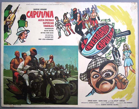 Lucha Libre / comedy film lobby card features a great caricature of Capulina, dressed as Sherlock Holmes -- with some masked wrestlers in the background. In the film, the chubby comedian teams up with some actual lucha libre stars to fight the bad guys. The card has moderate signs of use, but no major flaws... This movie starred Gaspar 'Capulina' Henaine, Alicia Encinas, Superzan, Tinieblas, Frankenstein and Nelida Bottini. $15 each |