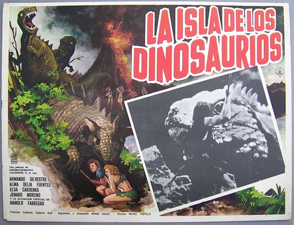 Rare Mexican sci-fi / dinosaur film lobby card has colorful graphics picturing prehistoric beasts... This movie starred Armando Silvestre, Alma Delia Fuentes, Elsa Cardenas and Jenaro Moreno. $15 each |