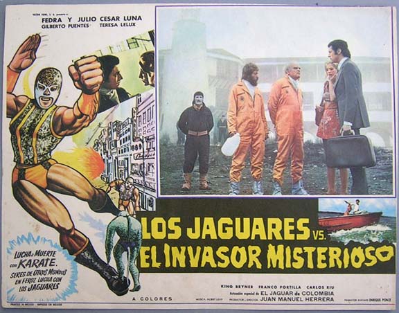 Attractive lucha libre / sci-fi film lobby card pictures the colorful masked heroes on the border art. Second film in the "Jaguares" wrestling series features the band of luchadors battling evil space aliens... This movie starred Los Jaguares, Julio Cesar Luna, Fedra, Gilberto Puentes and Teressa Lelux. $15 each |