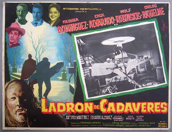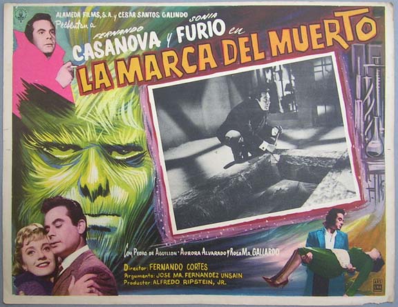 Early horror film lobby card has a colorful montage of creepy images, including some great vampire scenes. Light wear -- no major flaws... This movie starred Guillermo Murray, Mauricio Garces, Erna Martha Bauman and Silvia Fournier. $20 each |