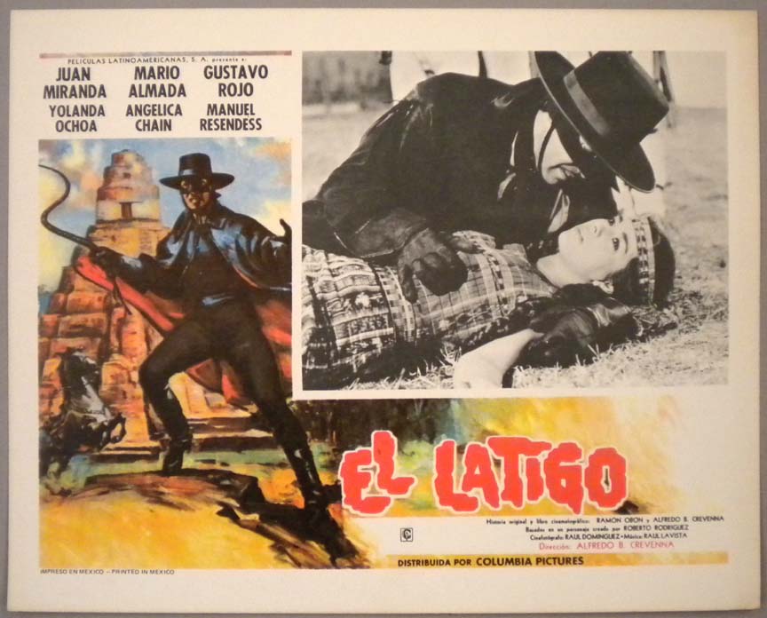 Attractive Mexican western / masked hero lobby card has a great central image of Miranda as the Zorro like main character... The film starred Juan Miranda, Angelica Chain, Mario Aldama and Gustavo Rojo. $20 |