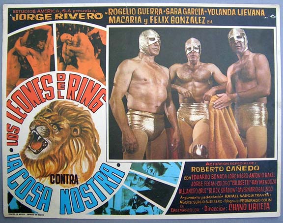 Unusual lucha libre film lobby card with an interesting circular design that features a montage of scenes from the film. Second and final film in the "Leones del Ring" wrestling series. The card has a few pinholes at the corners, but otherwise, it is clean and bright... This movie starred Jorge Rivero, Rogelio Guerra, Sara Garcia, Roberto Canedo, Macaria and Lobo Negro. $20 |