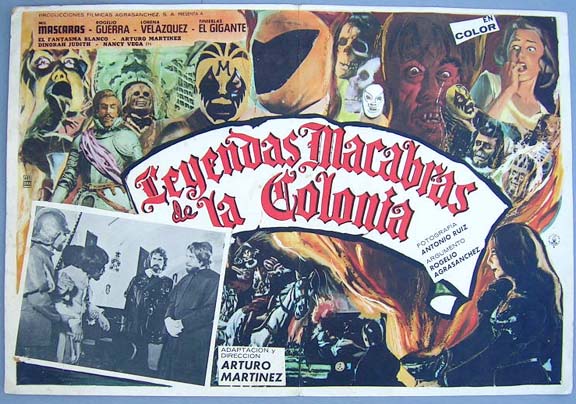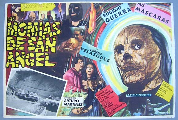 Colorful horror / lucha libre film halfsheet features lots of mummies, zombies, masked wrestlers and images of the popular Ms. Velazquez. Half-sheets (or Giant lobby cards) are horizontal format posters that measure approximately 16.5"x 24" and they usually have a single vertical fold. These posters (printed on heavy stock paper) were produced in place of standard Mexican lobby cards for some films in the early 1970s (particularly for the films produced by Rogelio Agrasanchez). Halfsheets feature full-color artwork covering most of the poster, with a small B&W inset image picturing a scene from the film. The poster has some light wear on the borders and along the fold, but this minor flaw doesn't greatly affect the colorful image area... This movie starred Mil Mascaras, Lorena Velazquez, Rogelio Guerra, Tinieblas and Nancy Vega. $25 each |