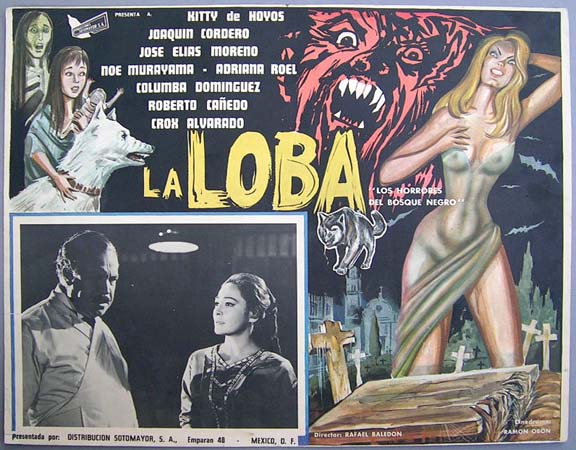 One of the classics of Mexican horror posters -- the graphics on this werewolf film lobby card are superb. The border artwork pictures a near-nude she-wolf -- surrounding her with various other horror related images. The card has light to moderate signs of use, including some pinholes, but no major flaws... This movie starred Kitty De Hoyos, Joaquin Cordero, Jose Elias Moreno and Noe Murayama. $35 each |