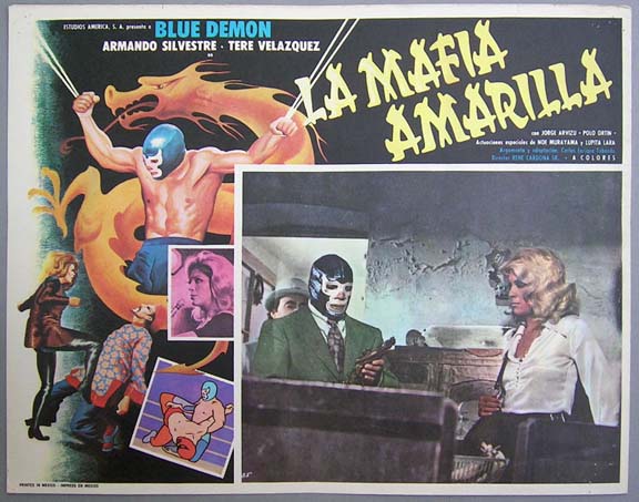 Beautiful lucha libre / crime film lobby card features superb artwork, picturing Blue Demon taking on a Chinese gang. The card also sports an attractive color inset scene. Light wear -- no major flaws... This movie starred Blue Demon, Armando Silvestre, Tere Velazquez, German 'Tin Tan' Valdes and Noe Murayama. Blue Demon scenes - $20 each ... Other cards - $15 each |