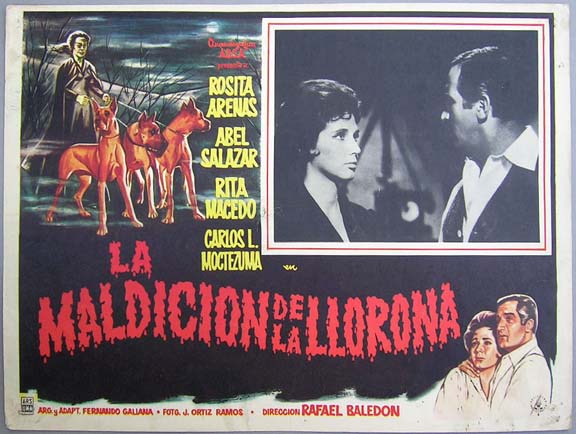 Attractive horror film lobby card is a little reminiscent in style to the Mario Bava classic, Black Sunday. The atmospheric and very creepy artwork pictures the title monster -- La Llorona -- and her trio of nasty pups. The card has light to moderate signs of use, but no major flaws... This movie starred Rosita Arenas, Abel Salazar, Rita Macedo and Carlos Lopez Moctezuma. $25 |