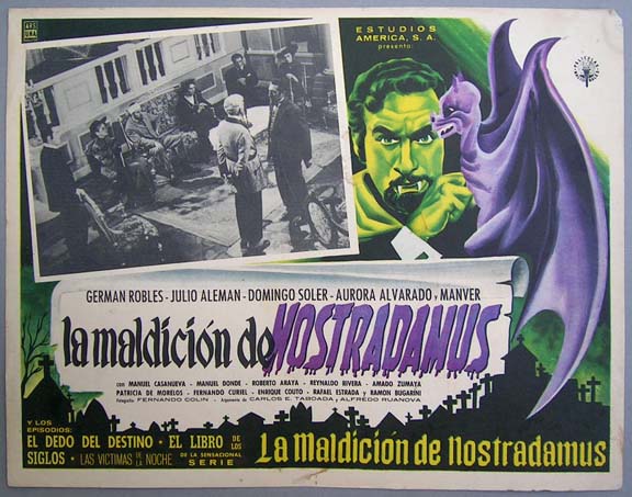 Beautiful horror film lobby card features a striking image of the south-of-the-border vampire -- this time sprouting wings! This was the second movie in this popular "Nostradamus" series. Great artwork! Light wear -- no major flaws... This movie starred German Robles, Julio Aleman, Domingo Solar and Aurora Alvarado. $20 each |